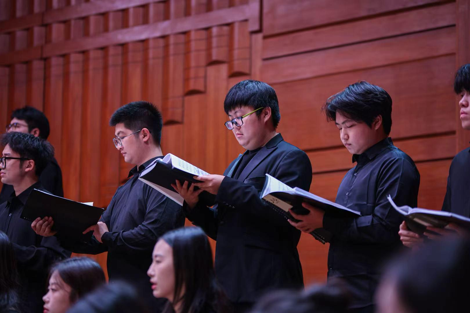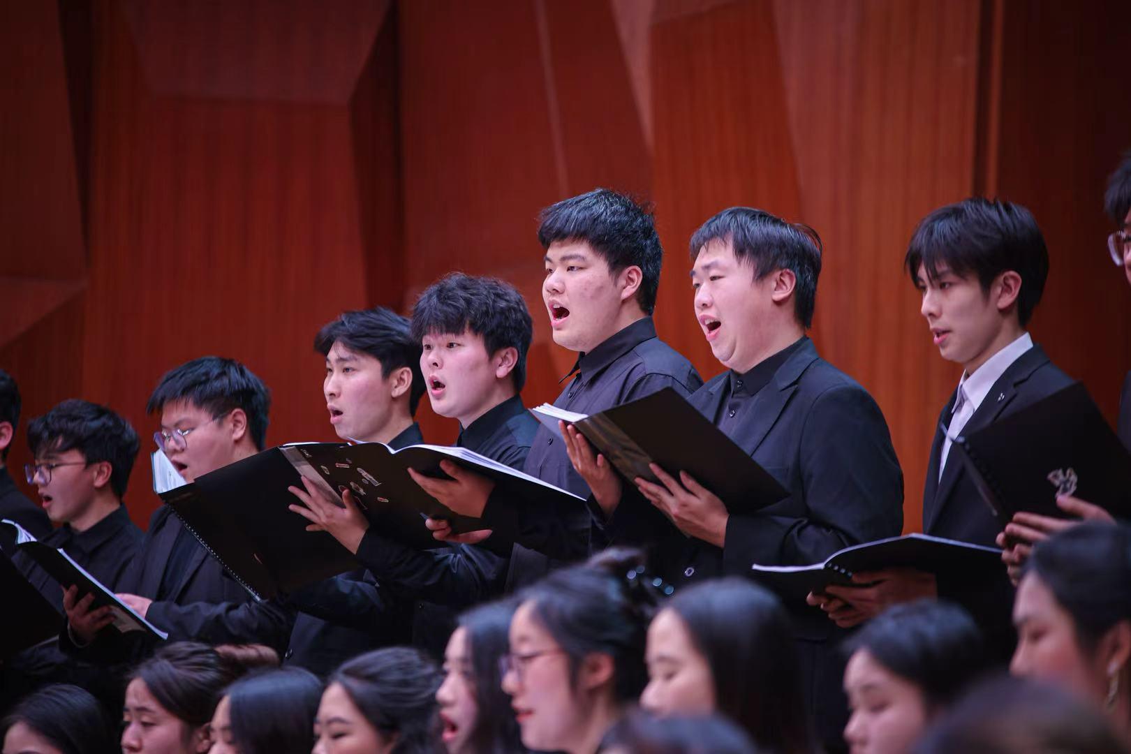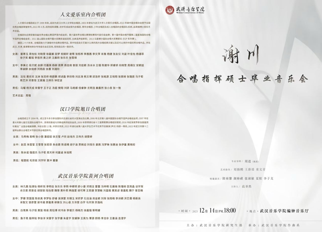 12月14日晚,武汉音乐学院合唱指挥研究生谢川毕业音乐会首场演出在编钟音乐厅如期举行。音乐会以“回望·启航”为主题,聚焦中外经典合唱作品。汉口学院旭日合唱团作为演出嘉宾,在音乐会下半场激情呈现了《黄河大合唱》选段。团员们以扎实的合唱功底与饱满的情绪表现,再现了黄河的雄浑气魄与民族的抗争精神,为当晚的学术性演出注入了澎湃的青春力量,也拉开了两场毕业音乐盛宴的序幕。