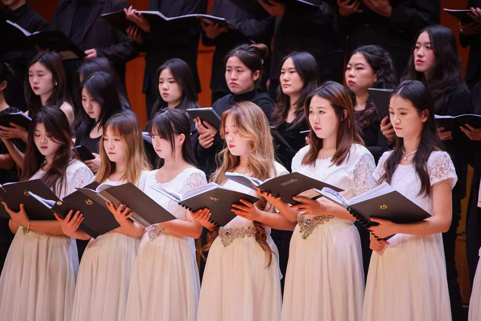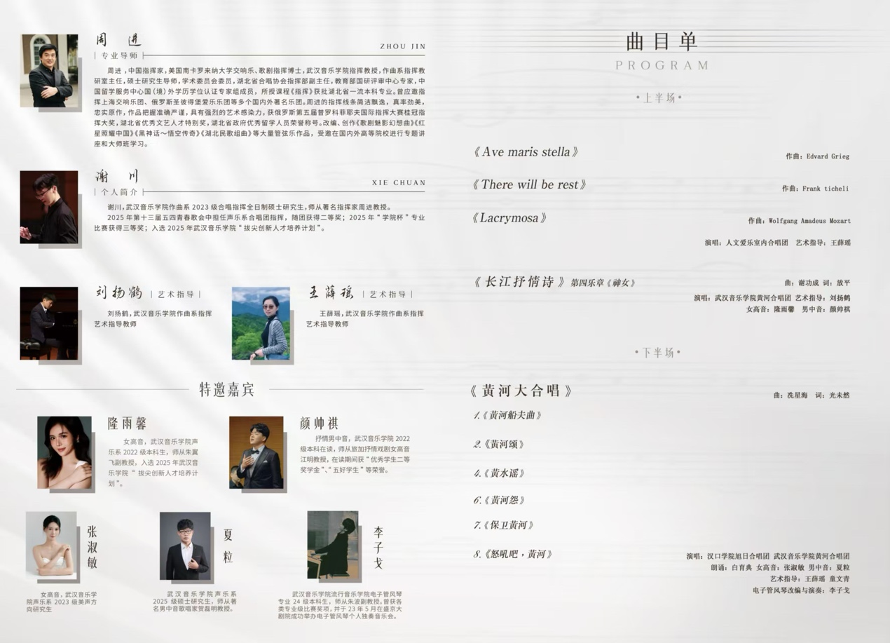 此次受邀参演,既是武汉音乐学院对兄弟院校艺术教育水平的认可,也为两校音乐学子提供了宝贵的同台交流与学习平台。在两场音乐会中,汉口学院音乐学院合唱团作为特邀演出团体,压轴呈现了《黄河大合唱》中气势磅礴的《黄河船夫曲》与深情激越的《保卫黄河》等经典篇章。