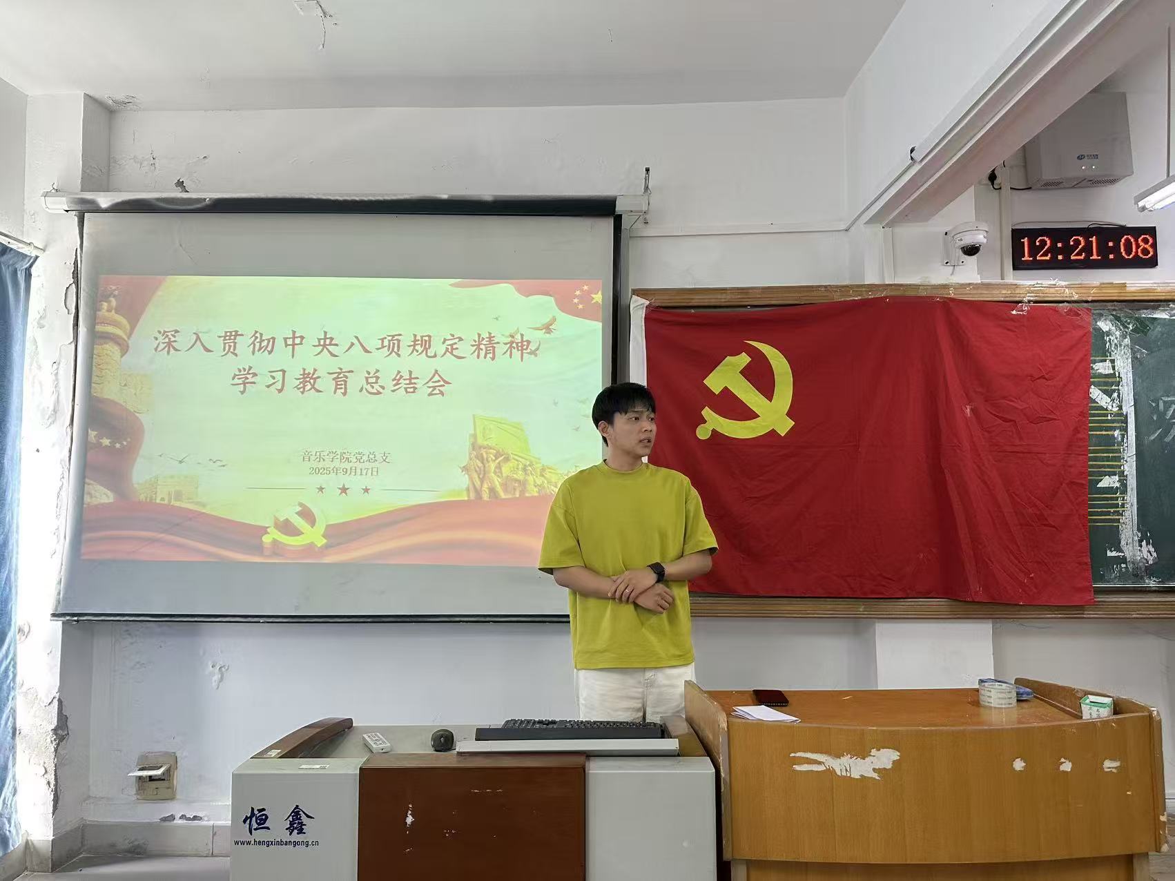 2025年9月18日中午,汉口学院音乐学院学生第一党支部在音乐楼二楼大教室召开深入贯彻中央八项规定精神学习教育总结会。全体党员、预备党员及入党积极分子参加了此次学习,会议由音乐学院学生第一党支部书记卢平主持。