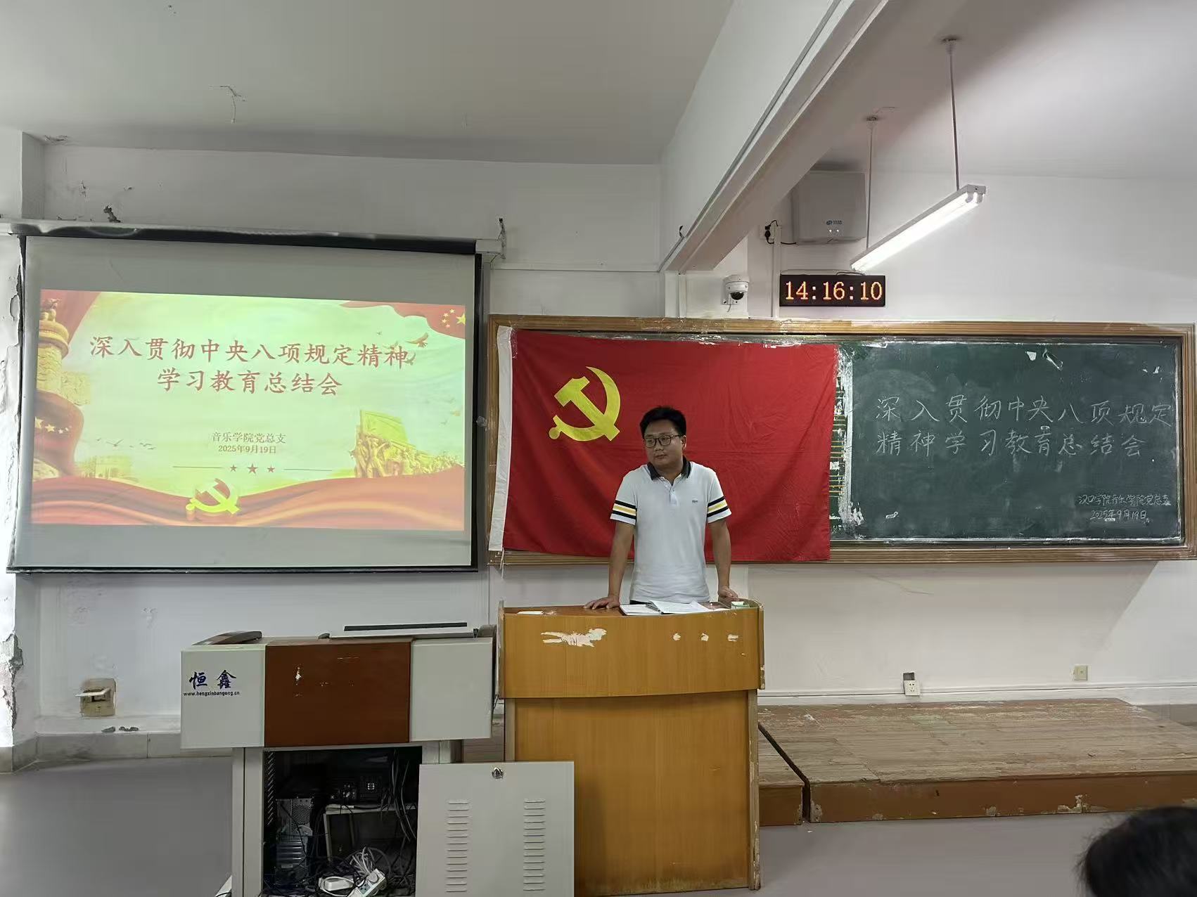 为巩固拓展学习教育成果,强化党员作风建设,汉口学院音乐学院教工党支部于2025年9月19日下午13:30,在音乐楼二楼大教室召开深入贯彻中央八项规定精神学习教育总结会。支部全体党员教师共同参会,会议由音乐学院党总支书记吴月主持。