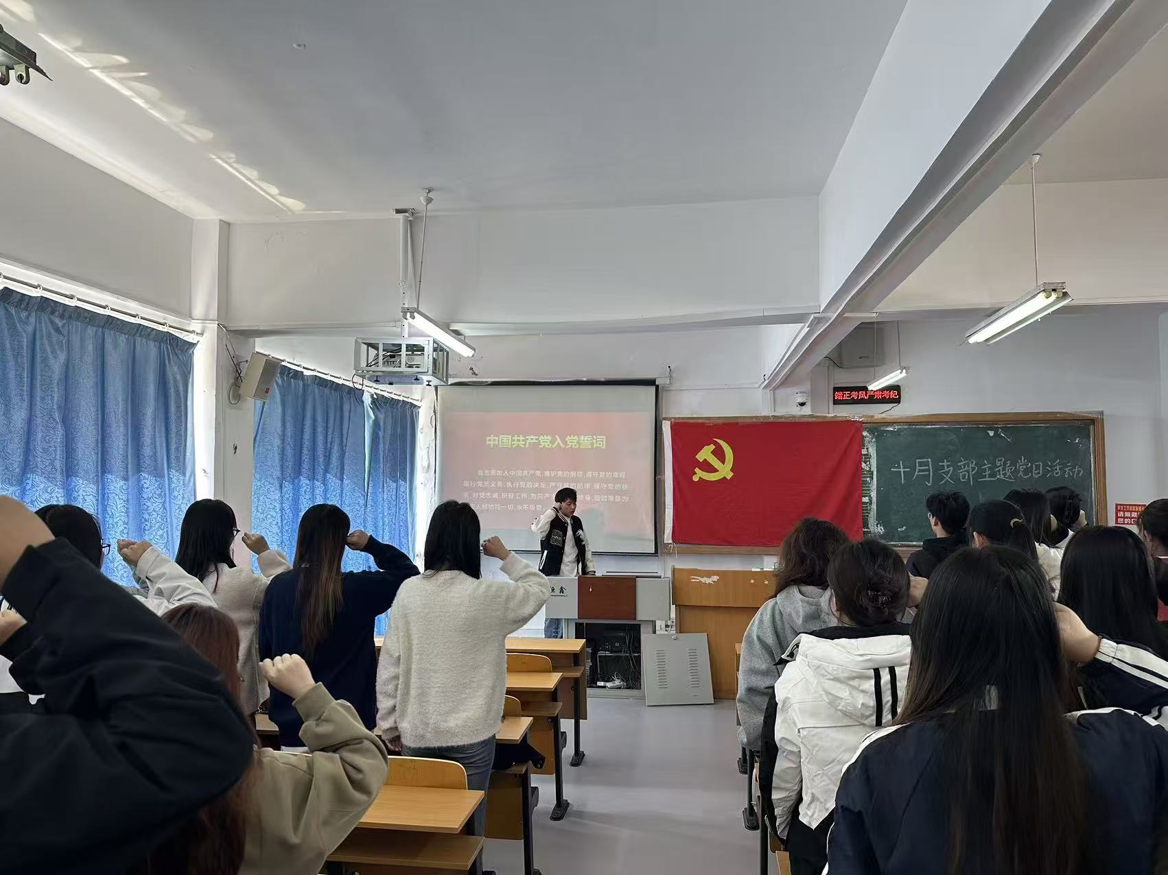会议伊始,卢平同志率先通报了党员到会情况以及当月党费交纳明细,程序公开透明,组织生活规范。随后,全体参会人员肃立,庄严肃穆地奏唱国歌。高昂的旋律唤起了大家心中的爱国情怀。在卢平同志的带领下,同学们面向鲜红的党旗,重温入党誓词。教室里回荡着宣读誓词的声音铿锵有力,让我们所有人谨记,不忘初心、牢记使命。
