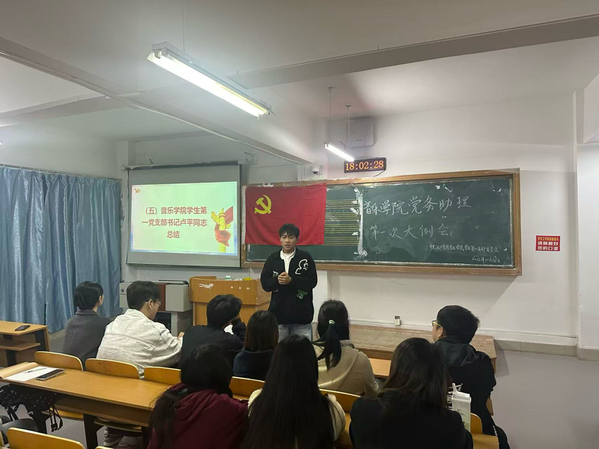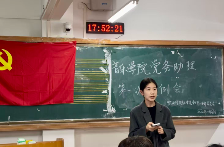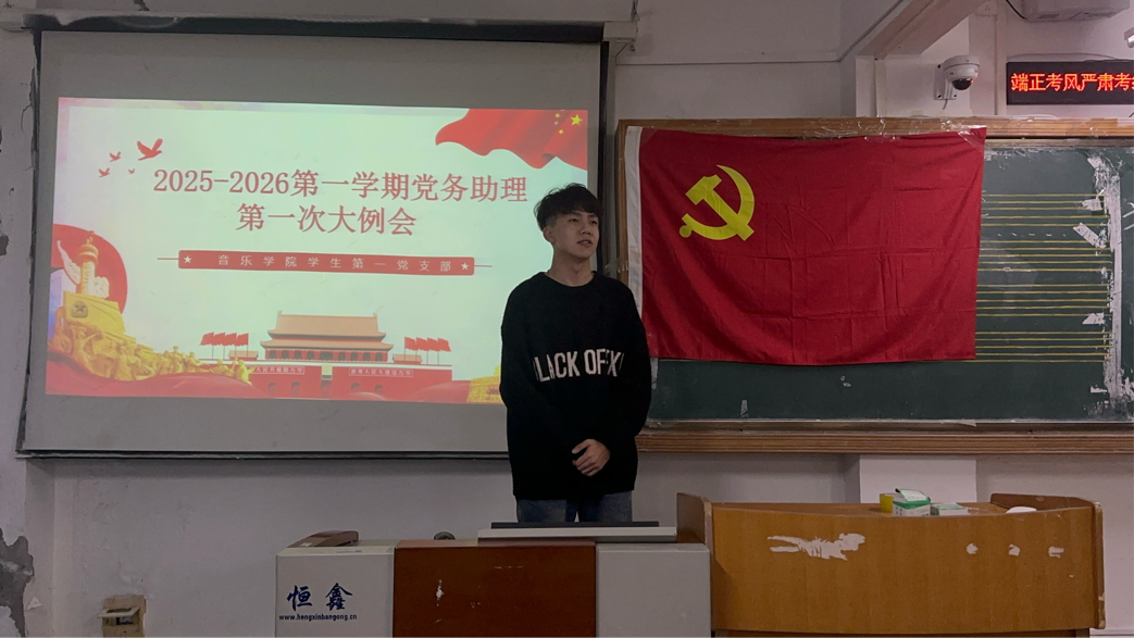 为规范新学期党务工作流程、凝聚党务助理团队力量,汉口学院音乐学院学生第一党支部于2025年10月28日下午17:30分在音乐楼二楼大教室召开2025-2026学年第一学期党务助理第一次例会,参会人员有:音乐学院学生第一党支部书记卢平、全体音乐学院党务助理。会议由学生党务助理负责人王新焱主持。