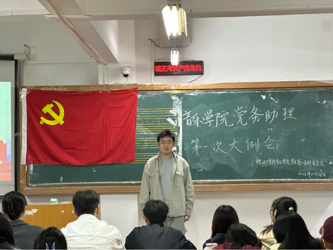 会议期间,学生党务助理负责人王新焱率先发言,分享任职以来的工作感想——既回顾了与团队共同推进党建工作的难忘瞬间,也表达了对新学期团队协作、党建提质的美好祝愿。随后,党务各组组长或副组长依次上台汇报:一方面系统总结半学期以来党务助理工作的成效,客观梳理当前工作中存在的衔接不及时、细节把控不足等问题,并提出改进方向;另一方面精准传达学校党委、学院党总支最新党建工作要求,同步部署本学期重点任务,涵盖协助策划开展主题党日活动、配合做好入党发展对象培养帮扶、规范整理党建档案材料等核心内容。同时,会议进一步明确各岗位的具体职责与分工,强调“纪律是工作底线、协作是效率关键”,助力团队整体业务能力提升。