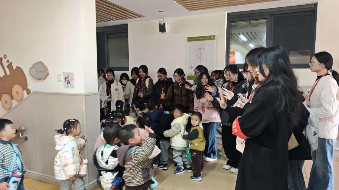 继大桥中心幼儿园师生来访我校梅林草坪成功开展“拾秋”自然课程后,2025年11月26日上午,汉口学院音乐学院学前教育专业学生在吴海霞系主任,汪曼主任和张婉婷老师的带领下来到江夏区大桥中心幼儿园,开展《学前教育原理》课程实践教学活动。从秋日自然天地走入童趣室内环创,标志着双方“幼校联合、双向互访”的实践教学模式日趋成熟与深入。